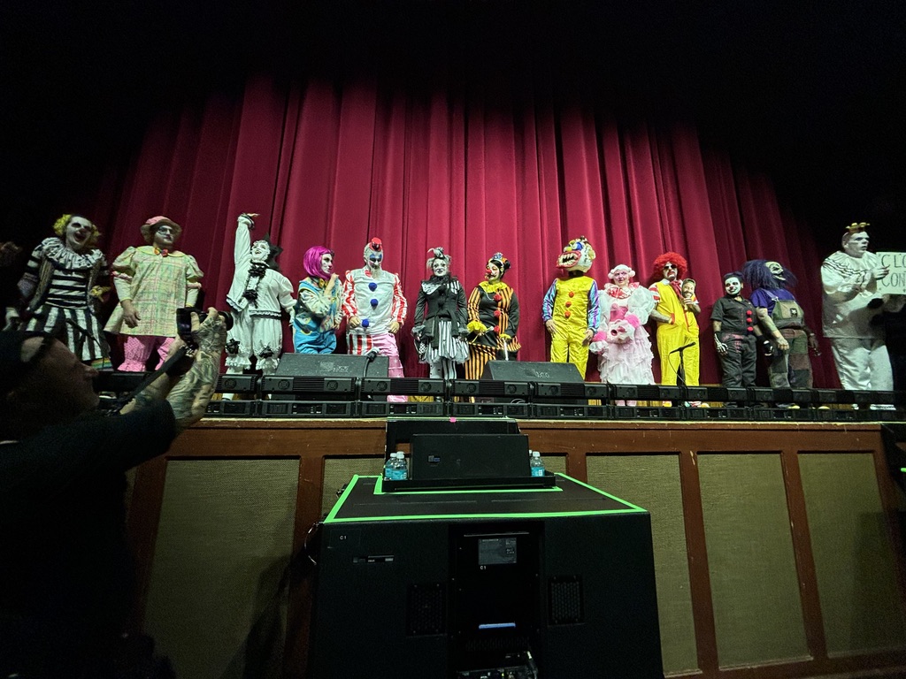 New Year’s Eve started with a fun opening set from Puddles the Clown’s act, Puddles’ Pity Party. For those of you not in the know, Puddles is known for taking songs and performing them to the tune of other songs. For example, he’ll take “Pinball Wizard” by The Who, and sing it to the tune of “Folsom Prison Blues” by Johnny Cash. It works remarkably well, and it’s hilarious at the same time. At the end of his set, he led all the fans who entered the clown costume contest on stage so the audience could vote for their favorite. The winner took home a Dash mini waffle maker. In the right photo below, the clown third from the left is the one who won.