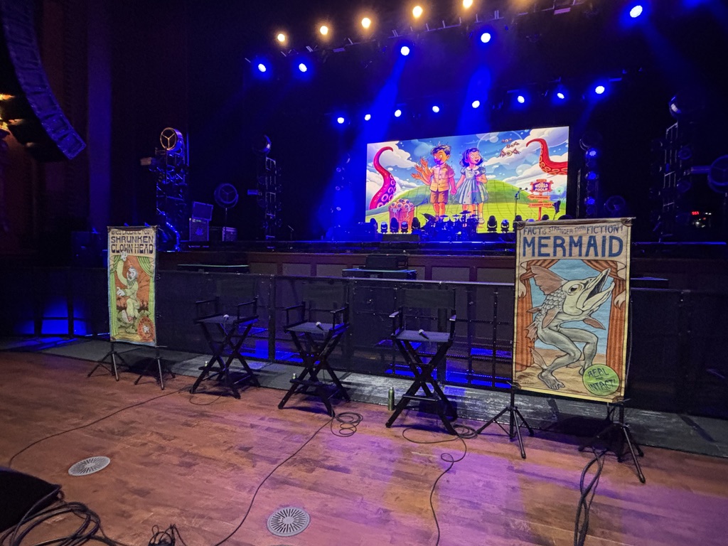 A Primus VIP package includes early entry into the venue, which, for a general admission standing-only floor, is a must for me, so that I can get to the rails and enjoy the show as close as possible. Once everyone is checked in, we all huddle together for the Q&A session with the band. Photos and videos are strictly forbidden during the Q&A, so here’s a photo of the vacant chairs and microphones, set up right in front of the stage.