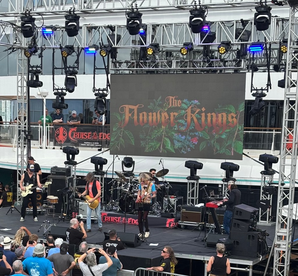 Wish Bone Ash was scheduled to perform at 2PM, but their show ended up getting postponed to tomorrow, I believe, at 1:30PM. There were a few other small acts performing as cruisers checked in at guest services and made their way to their staterooms. I’m thinking it can’t be easy to have a performance planned at such an early point in the voyage, when many people aren’t quite ready to fully appreciate the musical acts taking place. The very first CTTE event I sat in on was some of The Flower Kings’ set on the pool deck, which followed the traditional sailaway photo taken of the crowd as the ship left port. I only stayed for a few songs, just long enough to run into some good friends in the audience.