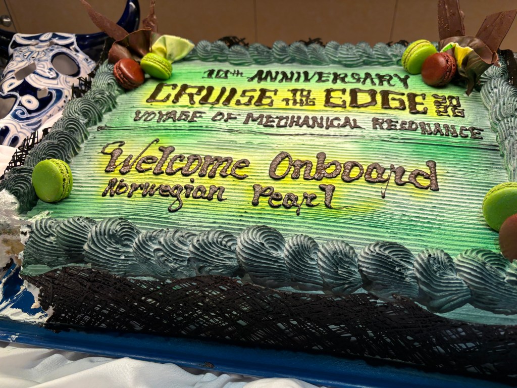 We boarded the ship a little earlier than expected, fortunately. We also got to our cabins at a reasonable time, unlike past cruises, where we’ve had to wait a few hours to get settled in. This cruise is taking place once again on the Norwegian Pearl, which hosted CTTE back in 2024, if I remember right. The cruise doesn’t take long to get the music rolling, for as we finished settling into our cabin, we were greeted with an already active schedule of musical acts and artist interactions. This cruise is particularly special because it is the 10th voyage of Cruise to the Edge. They even had a cake in the buffet on deck 12! It was vanilla with strawberry jam in the center.