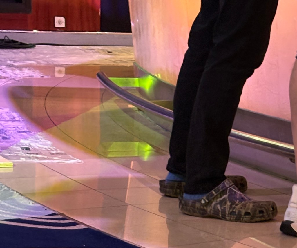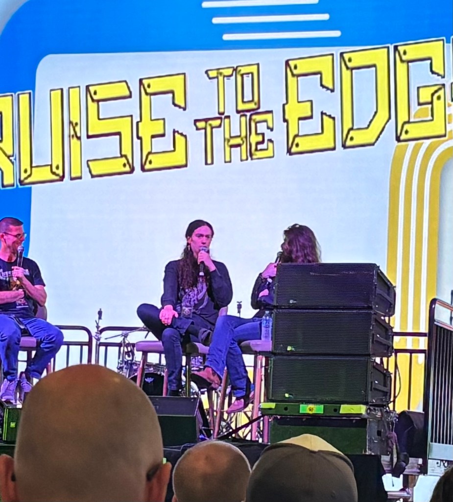 Anyway, the Marillion Q&A was a delight for all. Beforehand, H and Mark Kelly came to the Atrium floor to get drinks, just a few feet away from me. I was happy watching them, as a number of cruisers approached them for a hug or quick chat, which they adorably obliged. H was rocking these camo-print Crocs!