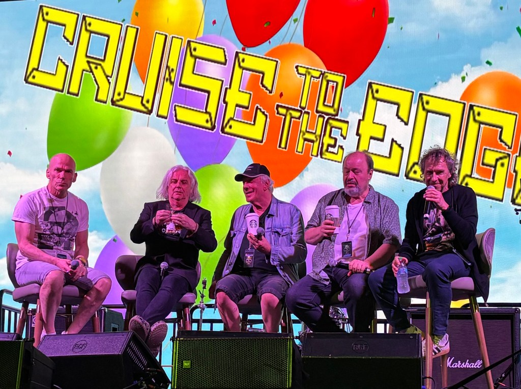 Later tonight, we had plans after dinner to catch an Italian band called Goblin, but they had to stop their set due to a downpour, quite literally, “raining on their parade.” I went by myself to the Stardust Theater at 9:30PM to see something I never expected to see featured on CTTE: Pete Roth featuring Mr. Bill Bruford. It was a trio with Bruford on drums, with heavy emphasis on jazz, rather than on prog, in my view. Pete Roth had plenty of jokes to crack in between songs. It was great to see everyone in good spirits after a long and busy day I decided to turn in for the night after that, and watched some of a Yes documentary showing in our stateroom TV. I couldn’t place it, but from the footage and video quality, it looked like a more recent one.