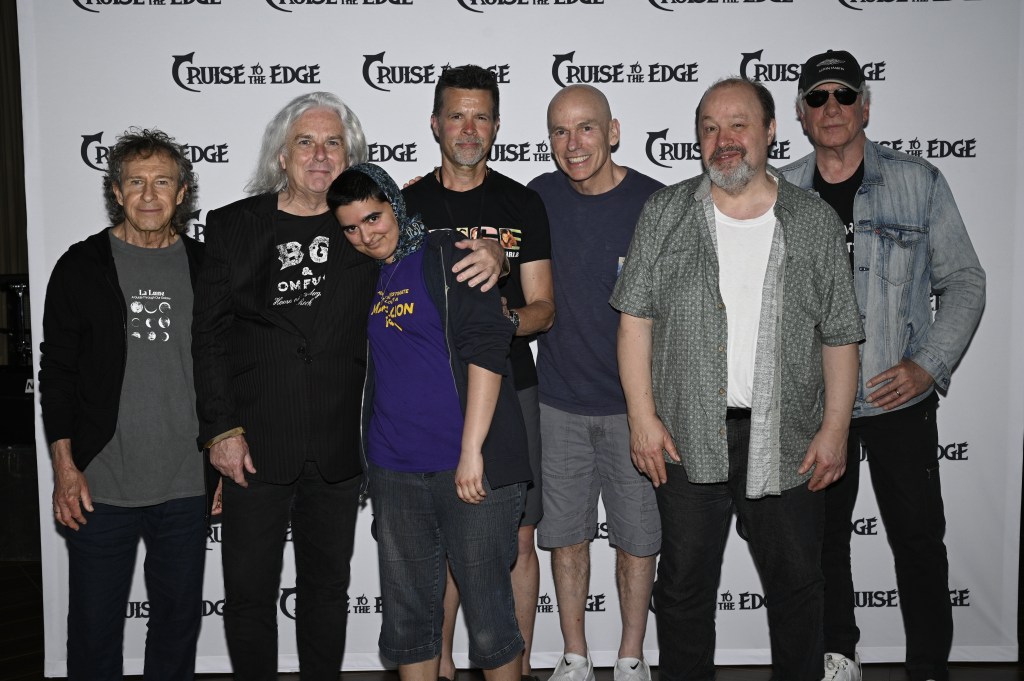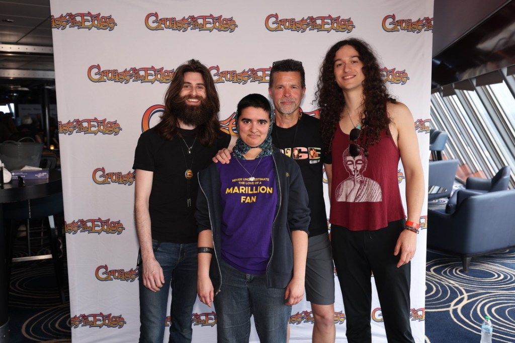 After that, I headed up to the back of the pool area to get in line outside the Spinnaker for the photo session with Adrian Belew, Crown Lands, and, of course, my beloved Marillion. The VIP pass holders were granted access first to the photo sessions, which forced the rest of us to stand in direct sunlight for well over half an hour. That said, it was a joy finally getting to get a photo with the entire band, since Pete Trewavas was absent in 2024 due to having surgery. H pulled me in close so I could put my head on his shoulder. At the end of it, I put a gentle hand on his shoulder and took Pete’s hand for a moment, and gave each member as sincere a look of appreciation as I could.
