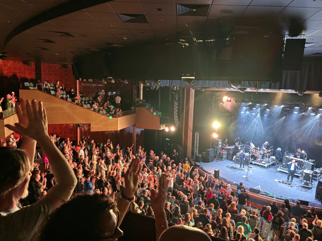 Tonight’s Marillion show was for those with blue laminates, but, as I learned on the 2024 cruise,there is a designated spot outside the Lotus Garden restaurant on deck 8 (assuming you’re on the Norwegian Pearl like we were) where guests wishing to attend a show that isn’t their color, can line up for a chance to receive a wristband that grants them access to their show of choice, once the VIP and people with the correct colored laminates are let in first. Being near the front of the line, I was surprised that this time, a certain number of people were allowed to be in seats in the section where we had gathered at one of the balcony sections.I ended up three rows from the front of the section, but I had brought along my binoculars for this exact scenario. Sorry, but I just couldn’t stand the idea of a Marillion concert happening right above or below me and me not being there, since this cruise remains my best chance at seeing them.