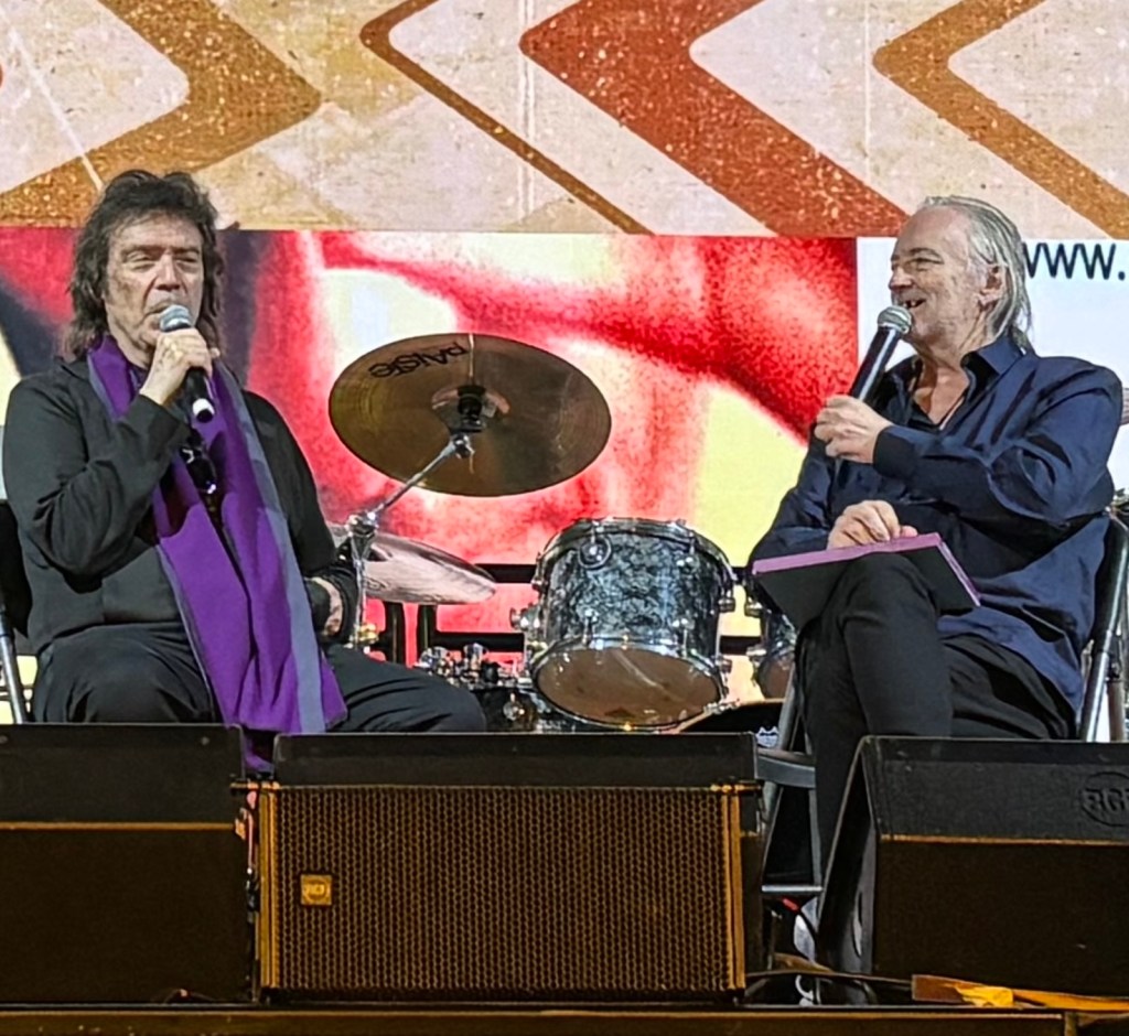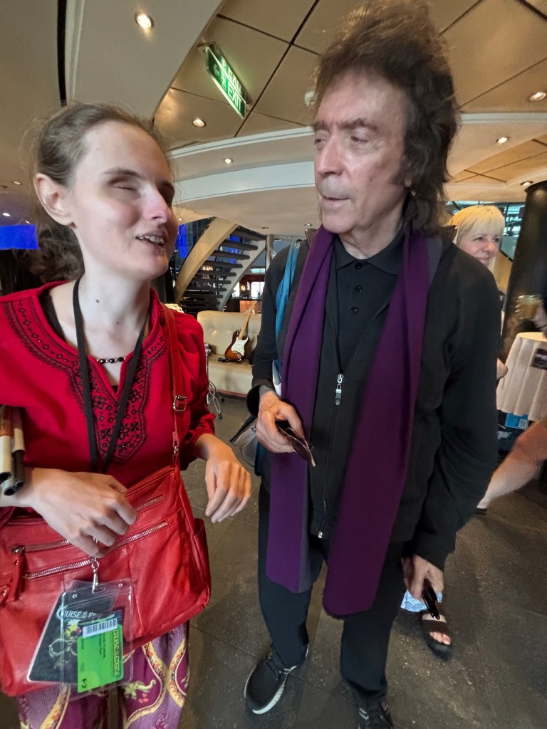 We were docked in Nassau this day. I decided to remain on the boat, though, as I’ve learned that there isn’t much for cruisers apart from tourist traps and overpriced goods. I can say that it paid off. I walked through the hordes of tables in the Garden cafe buffet to finally discover the Hacketts seated at a buffet,sheltered by a few other guests. I took the opportunity to connect with Steve and Jo as they were leaving to go ashore. We were all happy to be seeing each other again. Despite having had several up close, extended interactions with the Hacketts in the last 2 years, I was still touched that they recognized me. The mornings started off slowly, with not much planned that captured my interest until close to 1:00PM, with Mike Dawson in the atrium playing various 80s-era music videos for bands like Rush, Mike and the Mechanics, and Yes. The time between when that event finished was largely spent sitting in the atrium. I messaged Jeanie Flowers on our WhatsApp chat thread, and asked if she and Rachel would like to join me at 3:30 for Steve Hackett’s Q&A, in the hopes that I could introduce Steve and Jo to Rachel. I advised them to come down about an hour ahead of time since I was positive that there would be a big crowd gathering for that. The Q&A followed a short talk with photographer Armando Gallo, a long-time photographer for Genesis, who had just released a book featuring some of his work. I struck up a conversation with one of the people taking care of the books and book signing, after overhearing her mention being from Culver City in the greater Los Angeles area, right near my own neck of the woods. She seemed to know what I was talking about when I mentioned my hometown being Simi Valley, but it was hard to tell for sure.