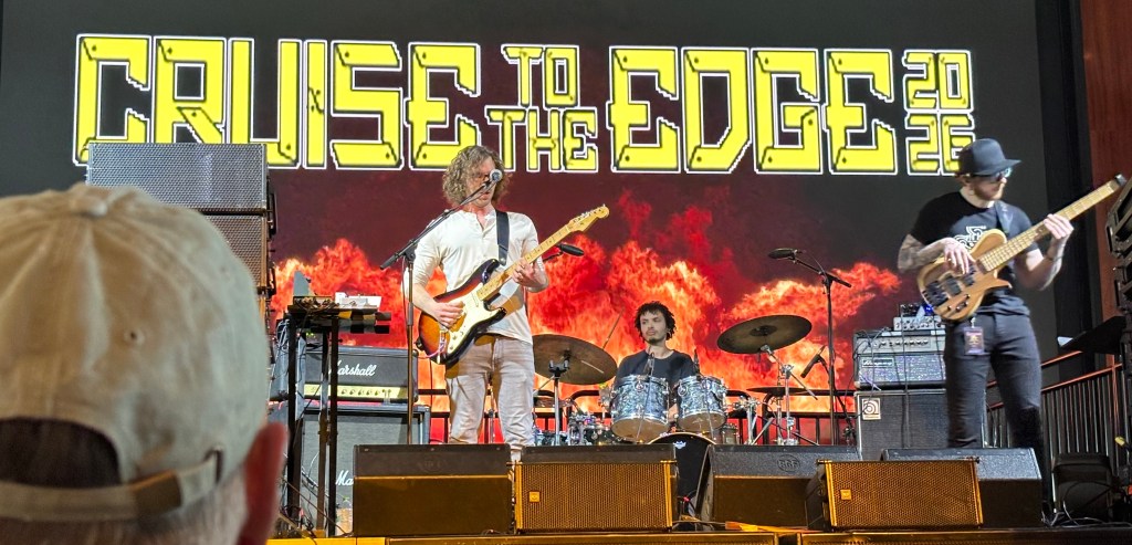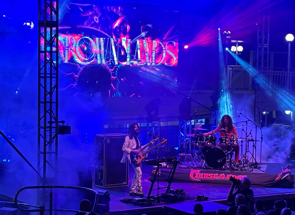 The excitement didn’t stop there. I had a quick dinner with my Dad in the Garden Cafe until he left to go take a walk. Shortly after, I got a phone call from my Dad with urgent news: H was right outside the cafe entrance. I left my partially eaten chocolate flan behind and went out to investigate. Sure enough, there he was, decked out in his PJs, chatting it up with fans. Since there was a dent group of people grabbing his attention, I felt my social anxiety kick in, and stepped off to the side, close enough for H to see me, but not close enough to get overwhelmed by the loud people surrounding him. Eventually the crowd quieted down to a dull roar, and the second H met my eyes, he held his arms out for a classic H-style hug. That is, it’s one of true happiness and love for his fans. I had time to tell him where I was from, and then he took my hand in his and gave me one more look of sweetness before heading to the elevator. A short encounter, but it made my day. The rest of the night was spent on Cloud 9 for me, and I headed to the pool stage one more time to catch some of Crown Lands’ set. It didn’t take long for me to pick up on the incredibly strong Rush influence, which I know they addressed at their Q&A, but it wasn’t until I heard them that I realized the depth of that influence. (Name) covered both the drums and vocals, the latter of which sounded like something straight out of early Rush. The guitar tones and keyboard effects played by (name) also reminded me of Rush. I got too tired to watch all of their set, especially with Daylight Savings Time beginning and shedding an hour of sleep time.