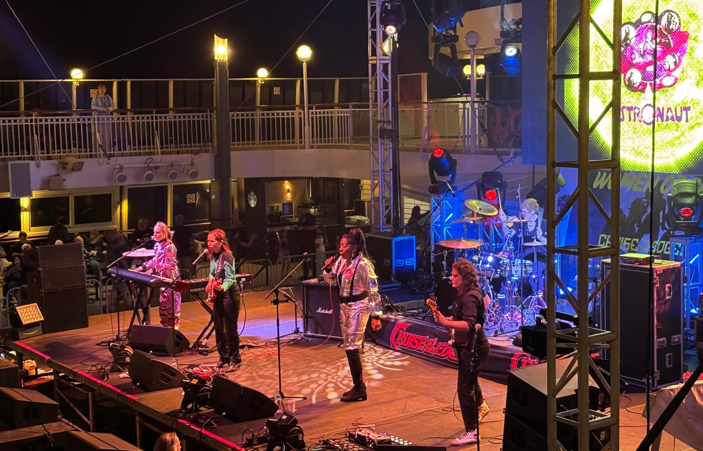 I headed up to the pool stage as soon as Marillion got out so I could catch Rachel performing with Estronaut. Rachel had told me the other day that the set would consist of them performing material from each other’s respective musical groups and projects, though they do have plans to write original content together at some point. I was thrilled to be standing on the upper level of the pool deck and looking down to see a good crowd of people that had shown up for their debut performance. I’m eager to know what they’ll be doing next.