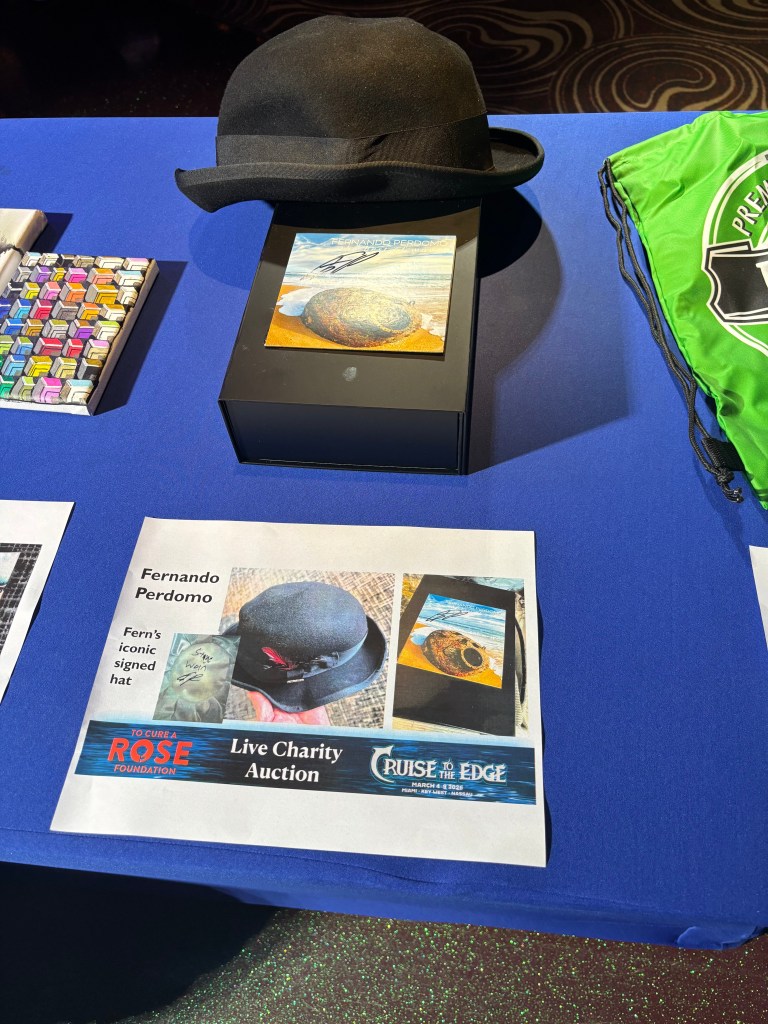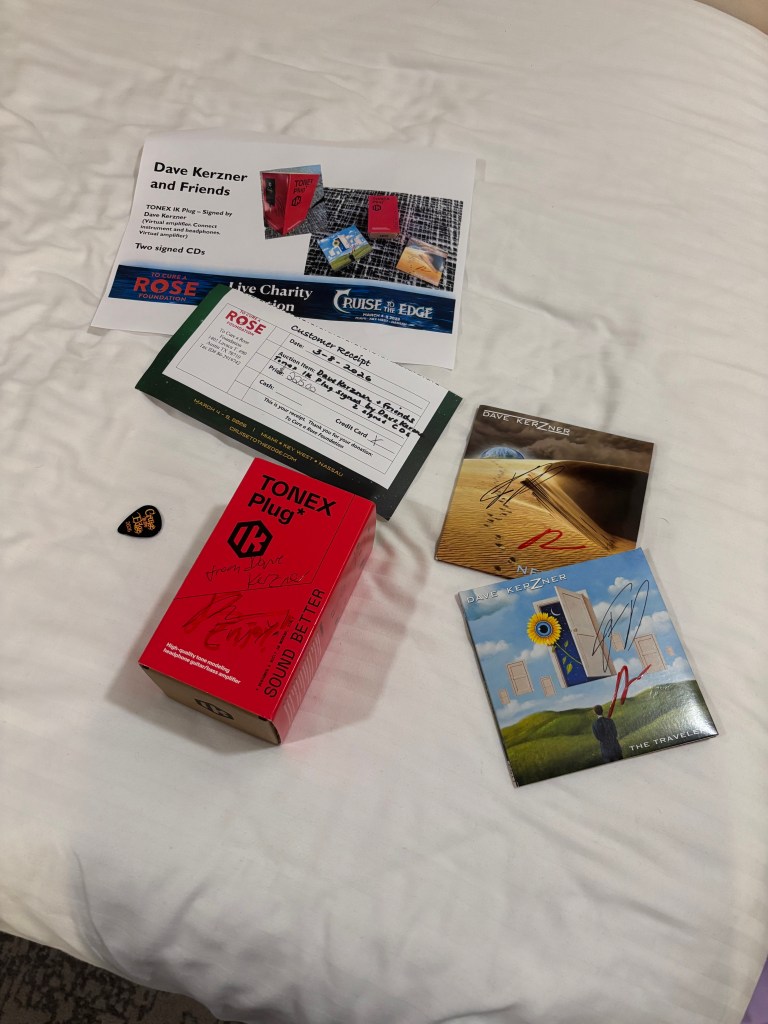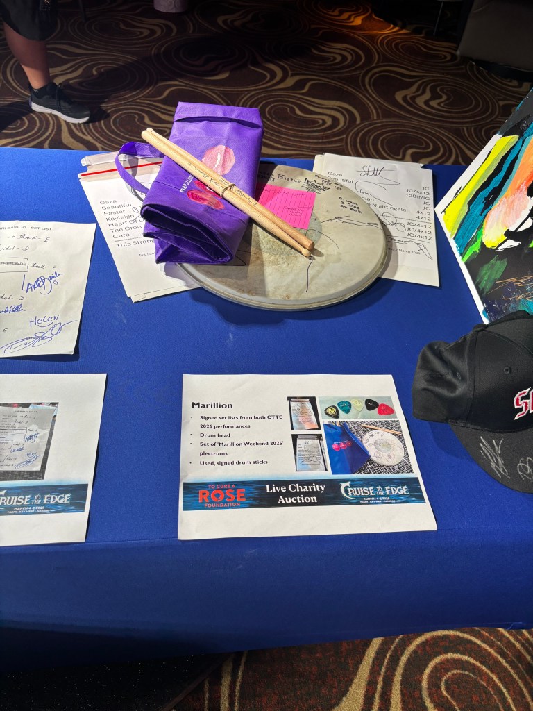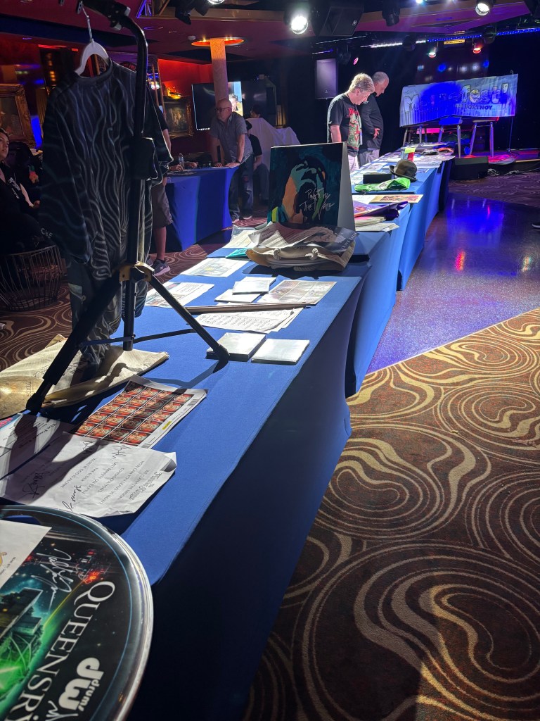 After their set, I went to the Bliss Lounge for the To Cure a Rose Foundation charity auction, which is featured on every Cruise to the Edge. I had attended this auction at my last CTTE in 2024 and ended up winning a Rush-inspired painting done by Ryo Okumoto of Spock’s Beard. I wanted to try and see if I could score something again at this auction, so I got there early enough to find a seat and then check out the long table of items offered. It was mainly signed albums, posters, and setlists by the artists featured on the cruise, but there were also a few small prints of original artwork made by Leslie Hunt of District 97.