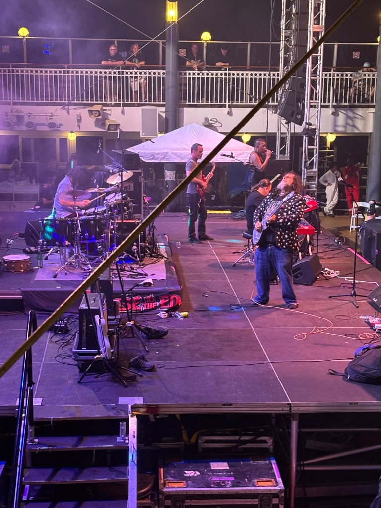 As afternoon came, so did our red laminate Steve Hackett show in the Stardust, scheduled for 3:15PM, with District 97 playing a set in the Atrium at 3:30PM. While my default has always been to go to Steve’s shows on past cruises, this time I decided to do something different. I decided to skip Steve’s show in favor of seeing District 97. I thought it over and considered the fact that I had just seen Steve only in November and would likely have way more chances to see him in the near future, with him touring every one or two years. I wanted to take advantage of one of the biggest perks of a cruise like this, which is the chance to see artists that you otherwise would never get to see perform. District 97 has been on other cruises I’ve attended, but I never bothered to check them out. I messaged my Dad about my decision and he understood, opting to go see Steve by himself. I found myself a good seat in the Atrium and enjoyed the show. I loved the energy displayed by singer Leslie Hunt and their fusion of prog and harder rock.