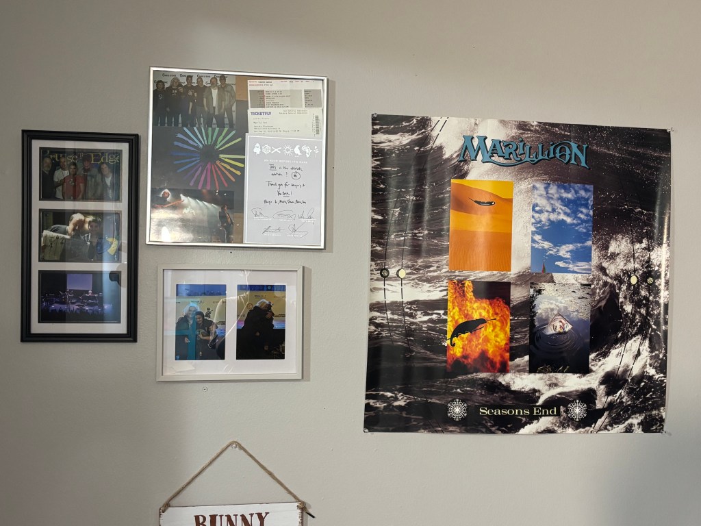 Anyway, this nostalgia inspired me to take some of the photos on my phone and computer and bring them to life by getting them printed into 4×6 pictures. I took advantage of Walgreens’ 1-hour photo print services, and within that time, I walked out with a stack of 40-something photos, packed in an envelope, like old times. I mainly chose photos from Cruise to the Edge, as well as some photos of special encounters with different artists. I especially wanted to get some of my Marillion-related photos printed so I could frame them and hang them proudly. I took a trip to the Dollar Tree and picked up a handful of frames of varying sizes. Looking back, I probably should have bought the frames first, so that I could decide on what size to make each photo, since not all the frames I got can fit 4×6. Regardless, here’s what I have so far. Sorry, the lighting in my place isn’t great, and I’m working on making that frame containing my Marillion ticket stubs a little neater: