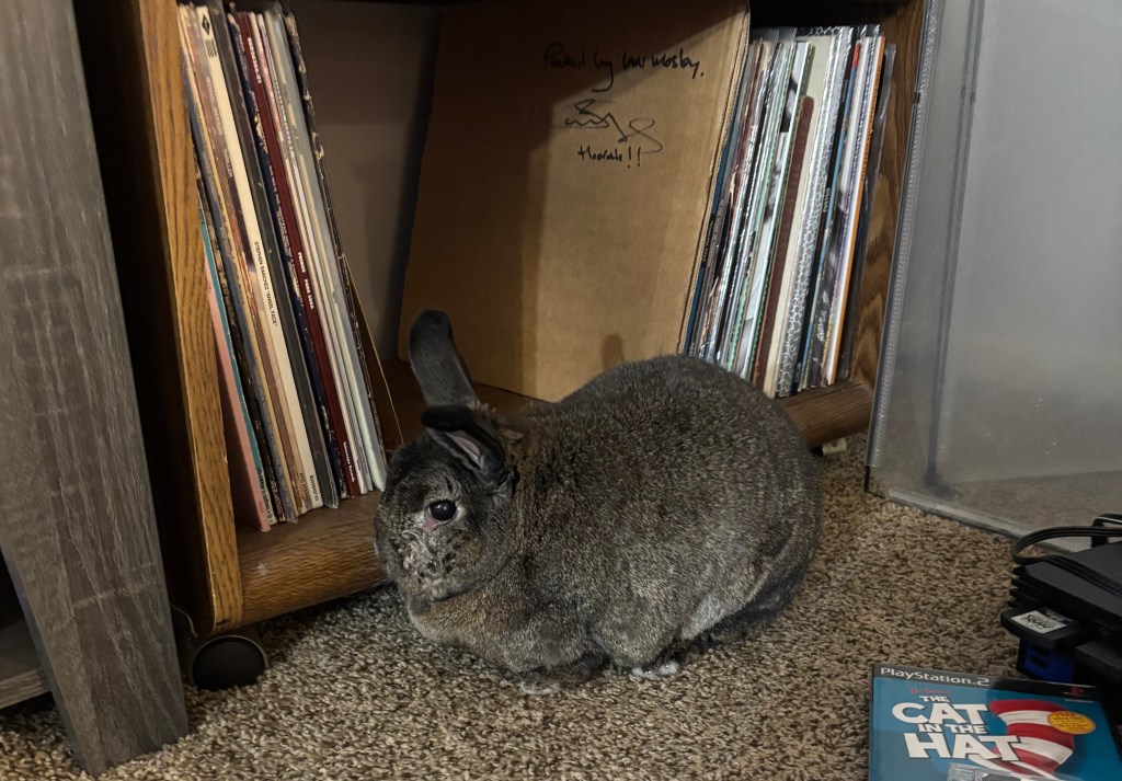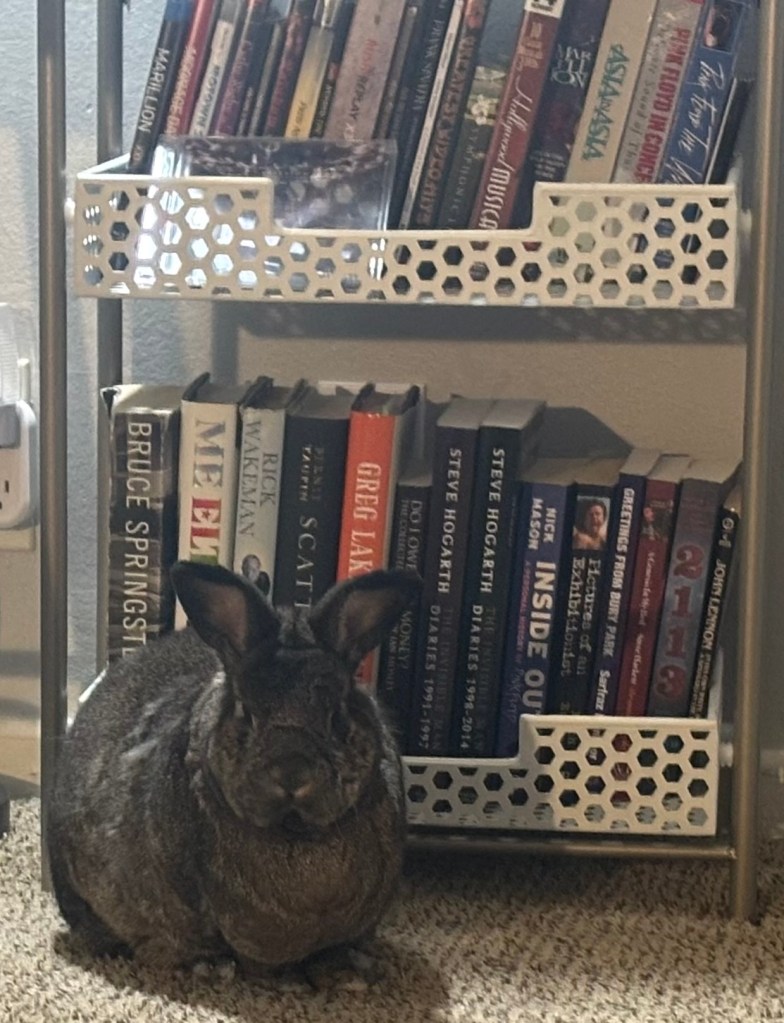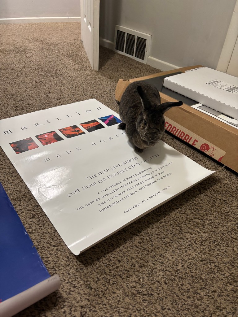 Happy Thursday, all! It’s a gray early evening here in Omaha, with a flash storm consisting of heavy rain, small hail, and strong wind coming and going. The first piece of good news I have to share is that I finally stopped dicking around and put my foot down. I decided to adopt my foster bunny, Sonny. Having had him for a little over 2 months, I couldn’t run away from the connection we had made in that time. Even though he’s around 6 years old, he’s still my little boy, and I want him to spend the rest of his life with me. He’s made me laugh quite a few times when he’s hopped around and explored some of my music memorabilia, although sometimes he’d get too curious and start chewing. My white Marillion “Made Again” poster now has some nibble marks on the top as a result. Anyway, here’s some photos of when he’s taken an interest in my music collection: