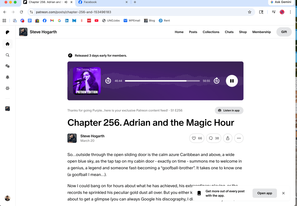 Last, I can’t believe that I, an avid Marillion lover for nearly a decade, never subscribed to H’s Patreon account in support of his podcast, The Corona Diaries. A membership was inexpensive, so I joined it, and listened this afternoon to an episode that H actually recorded on the last day of Cruise to the Edge with Adrian Belew. I’m about 383 episodes behind, so I have some listening to do!