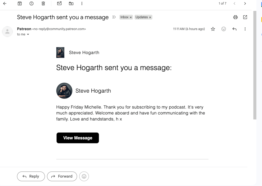 This morning, I discovered this email sitting in my inbox. I keep in mind that it may be an automated message, but the fact that he addresses me as Michelle instead of J Michelle makes me hope it was personally written. Either way, I’m happy to have received it, and am always honored to support H and his bandmates in any way I can manage.
